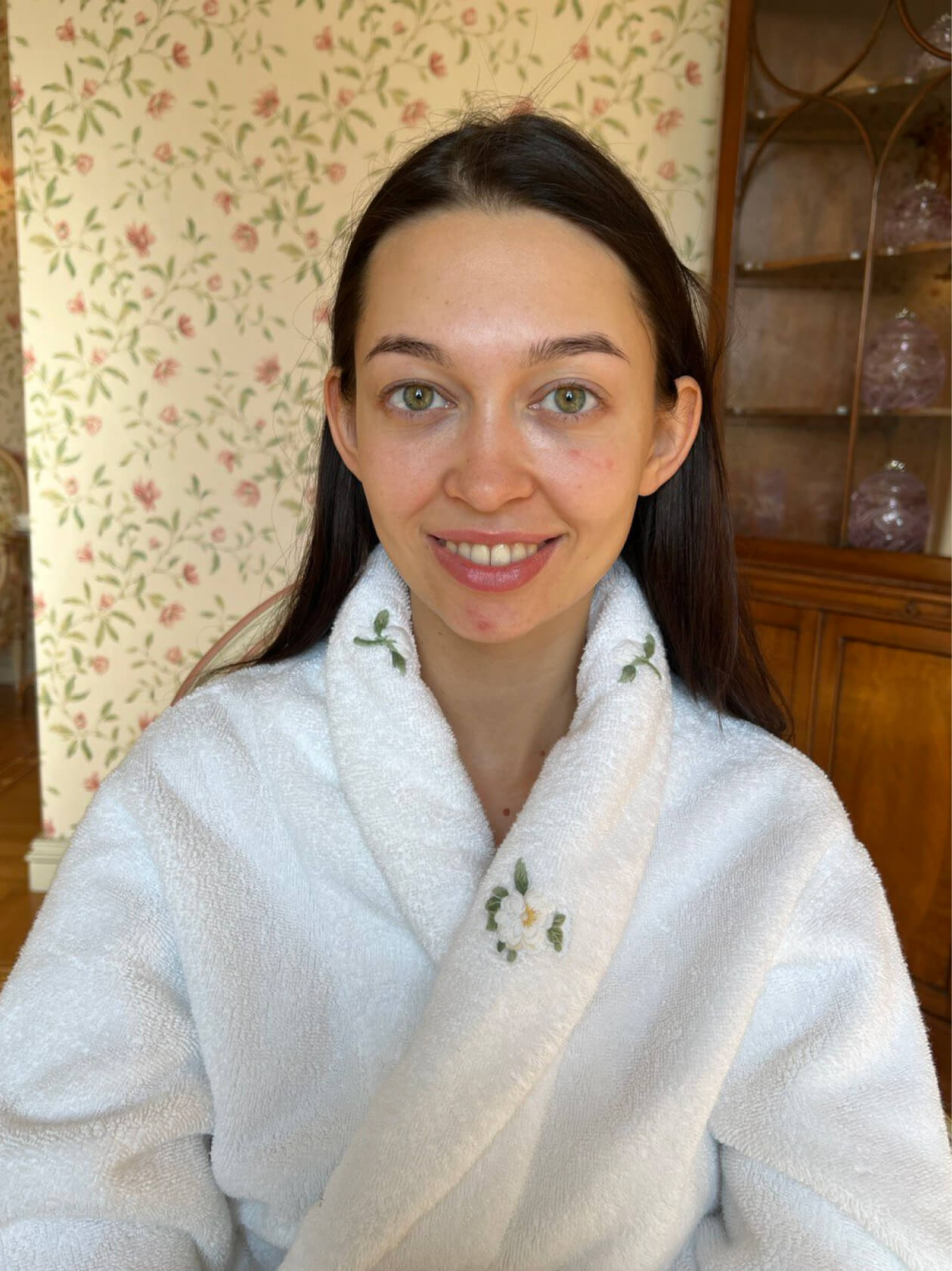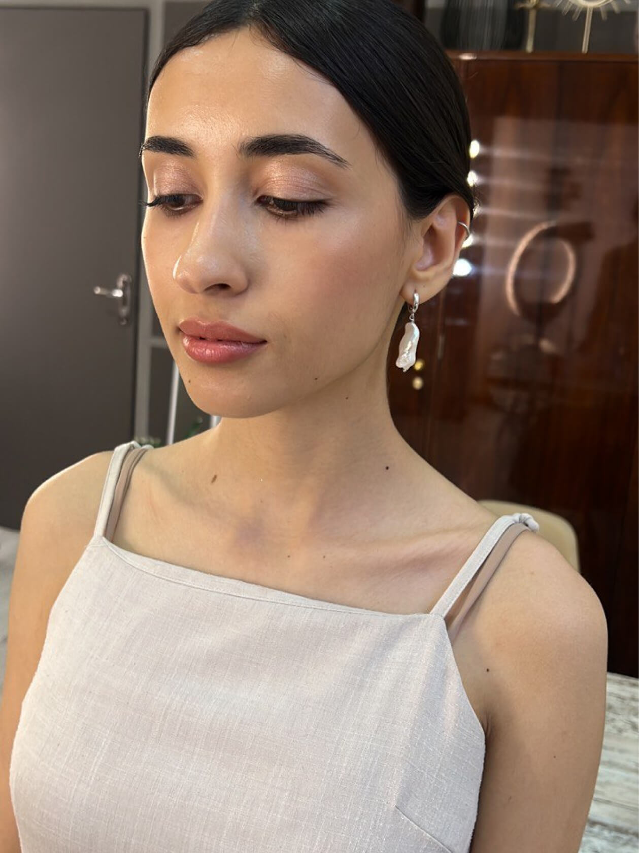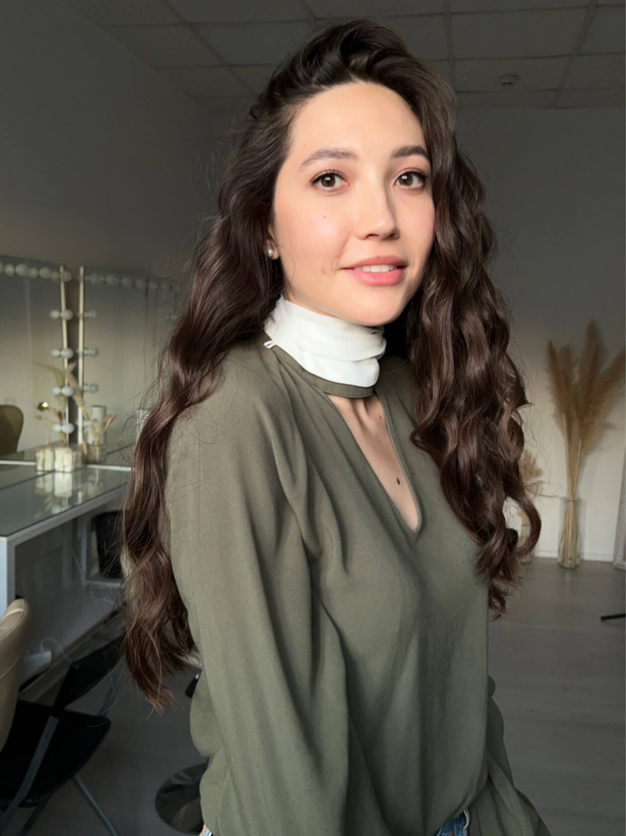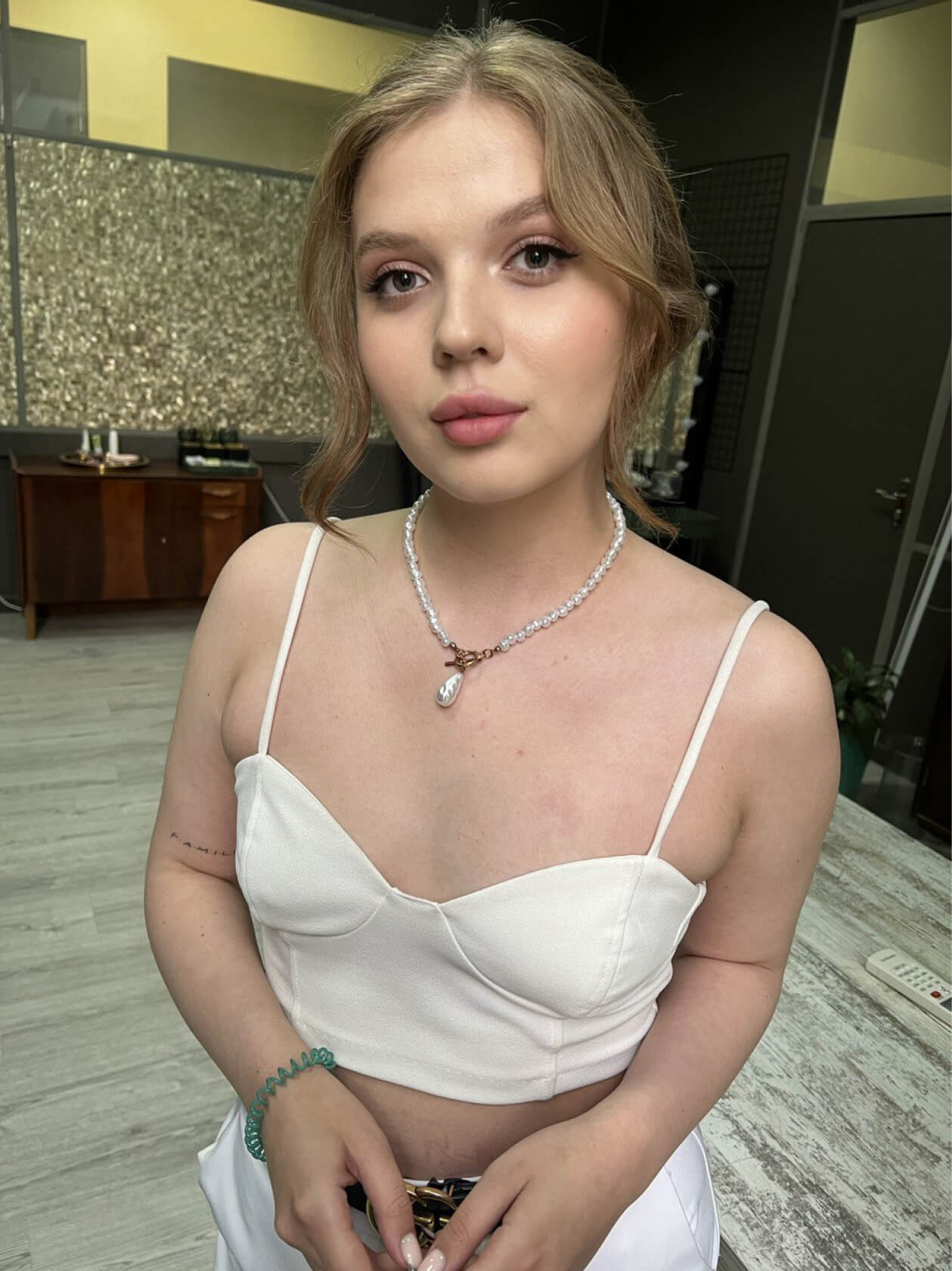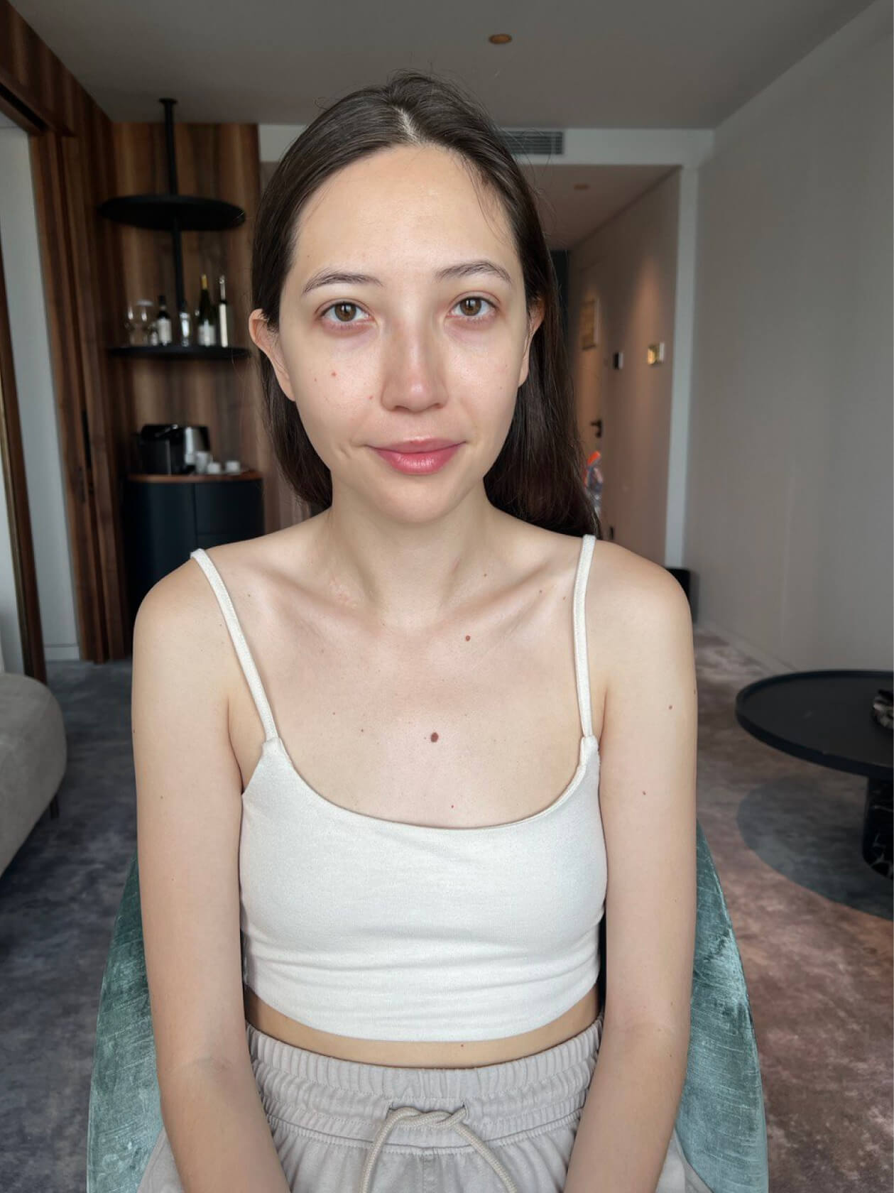Оля сразу знала, что хочет нюдовый макияж со стрелочкой, чтобы получился лисий взгляд.
