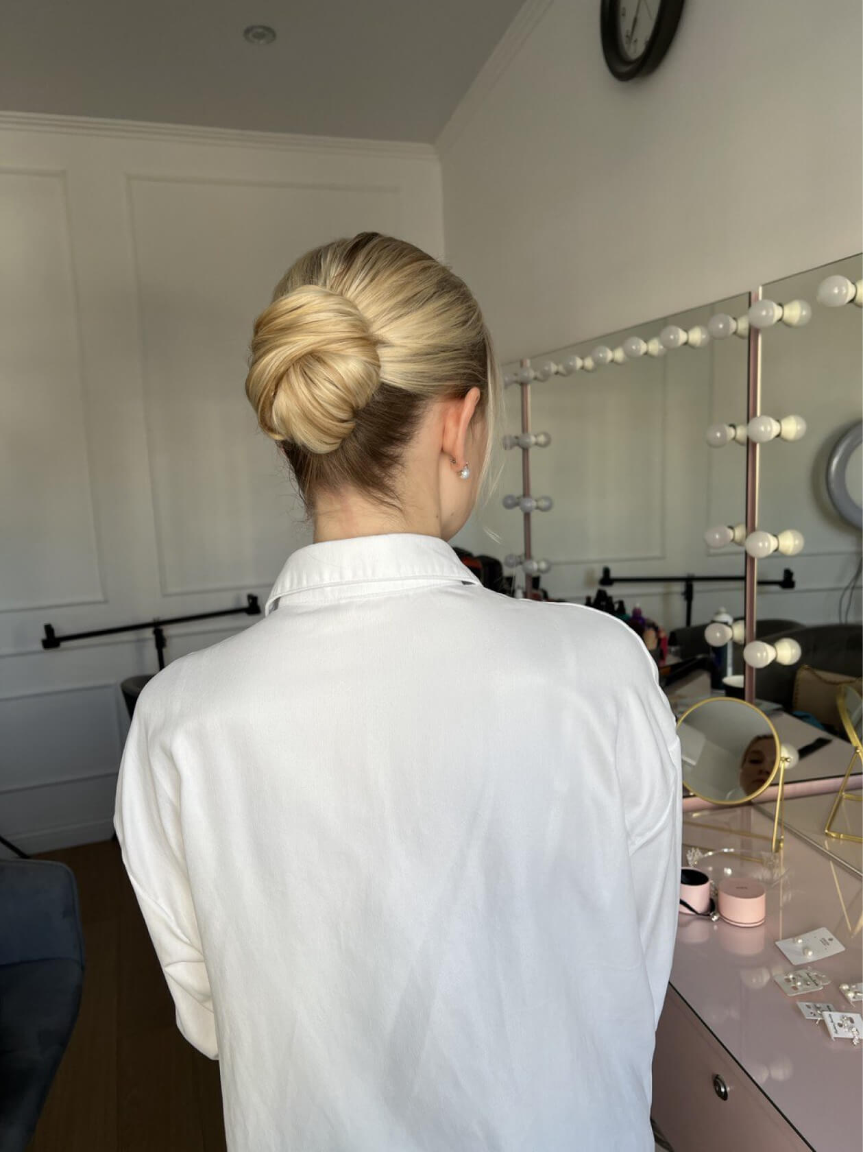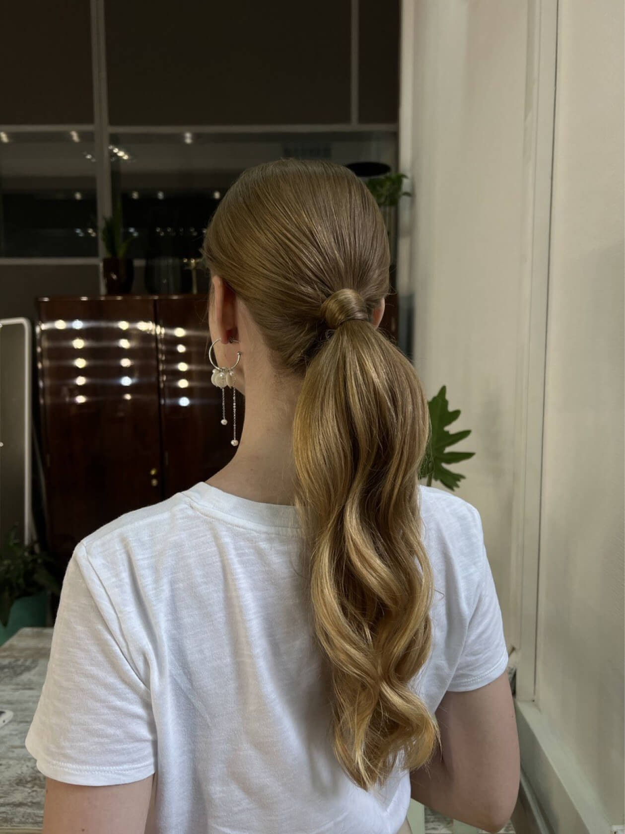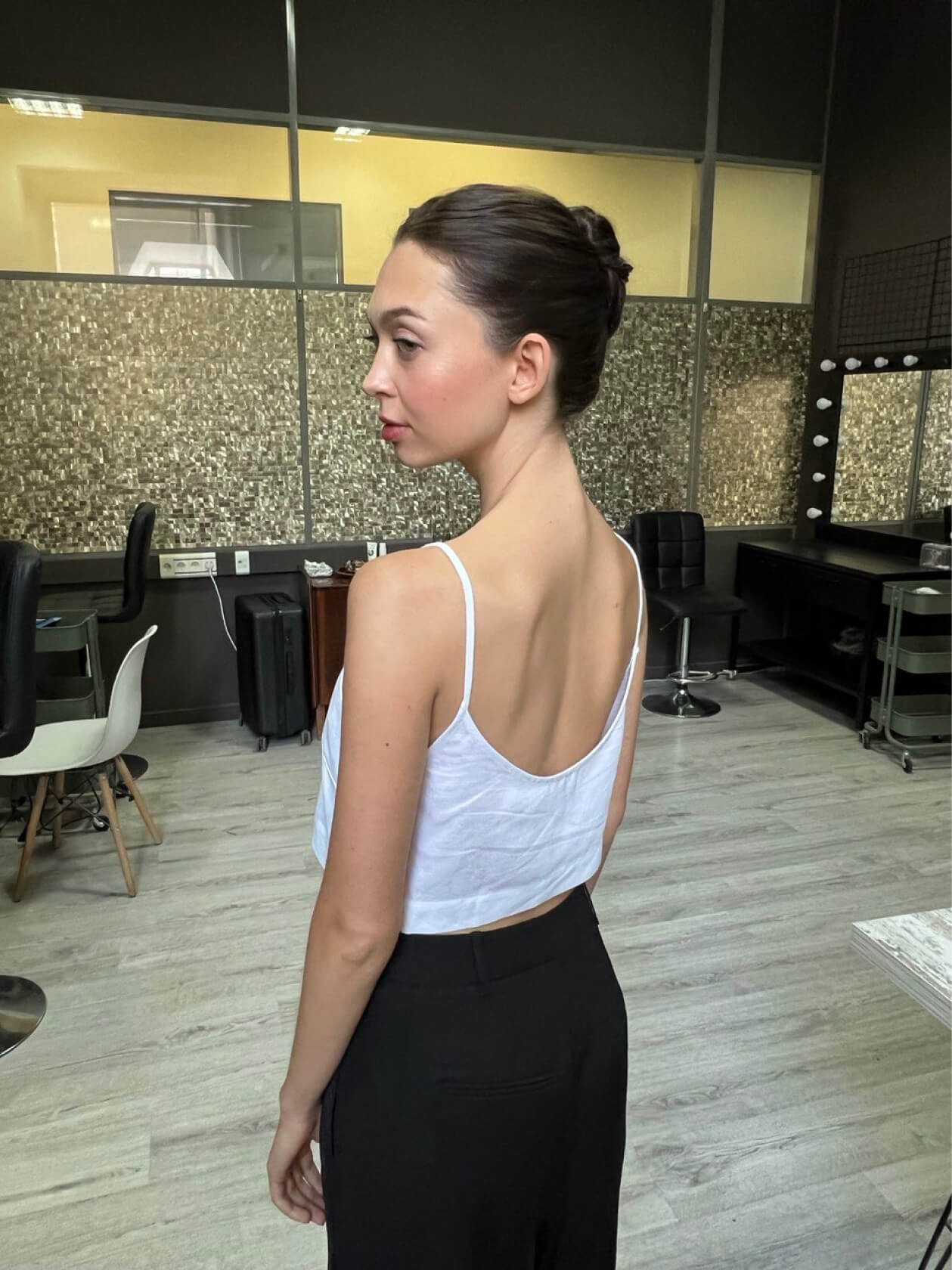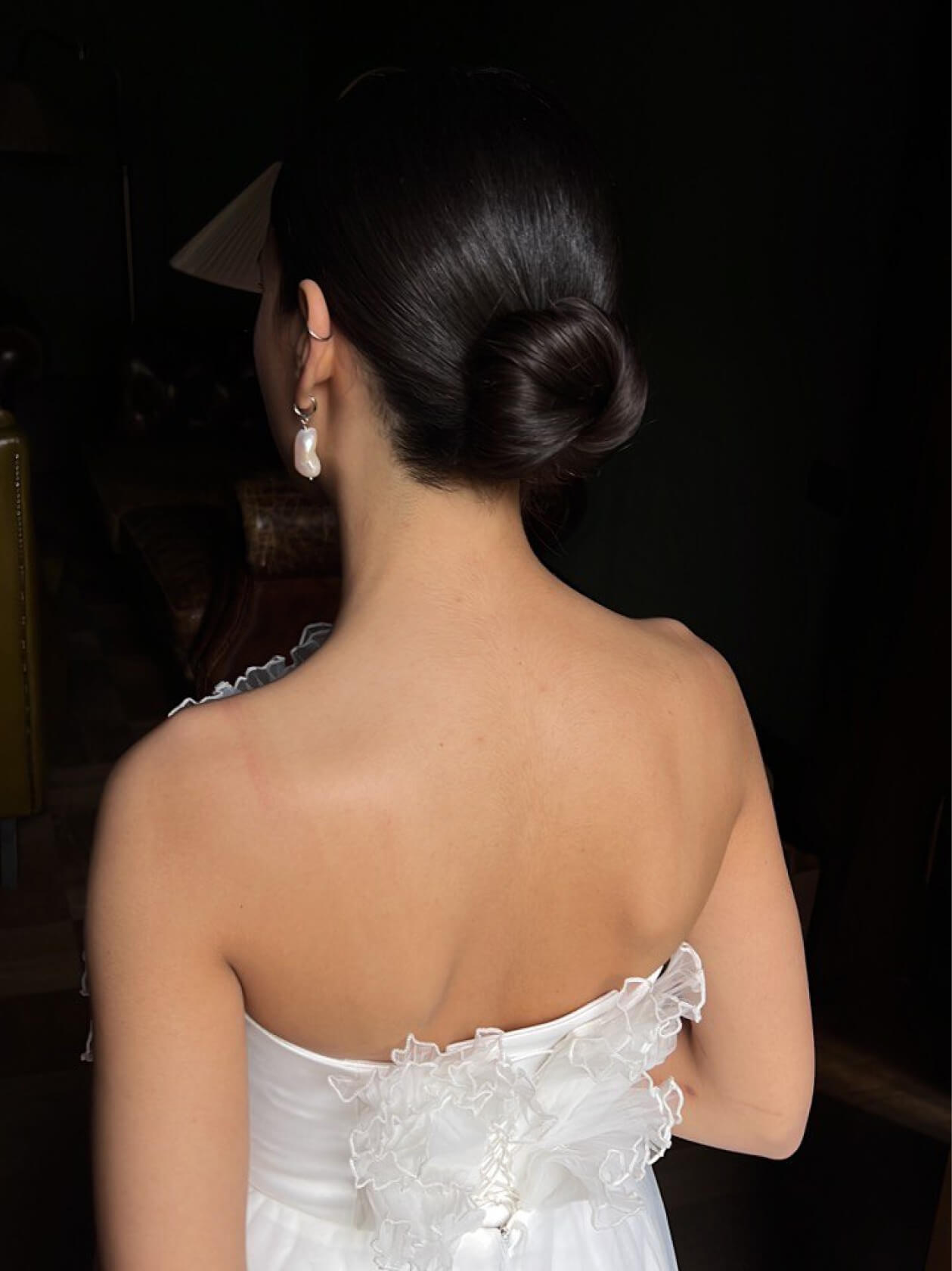 Чтобы этого не происходило, мы заранее напитали волосы увлажняющим стайлингом и запечатали кутикулу феном, а уже потом собрали пучок.