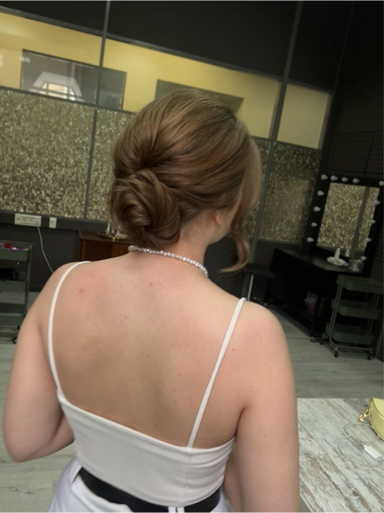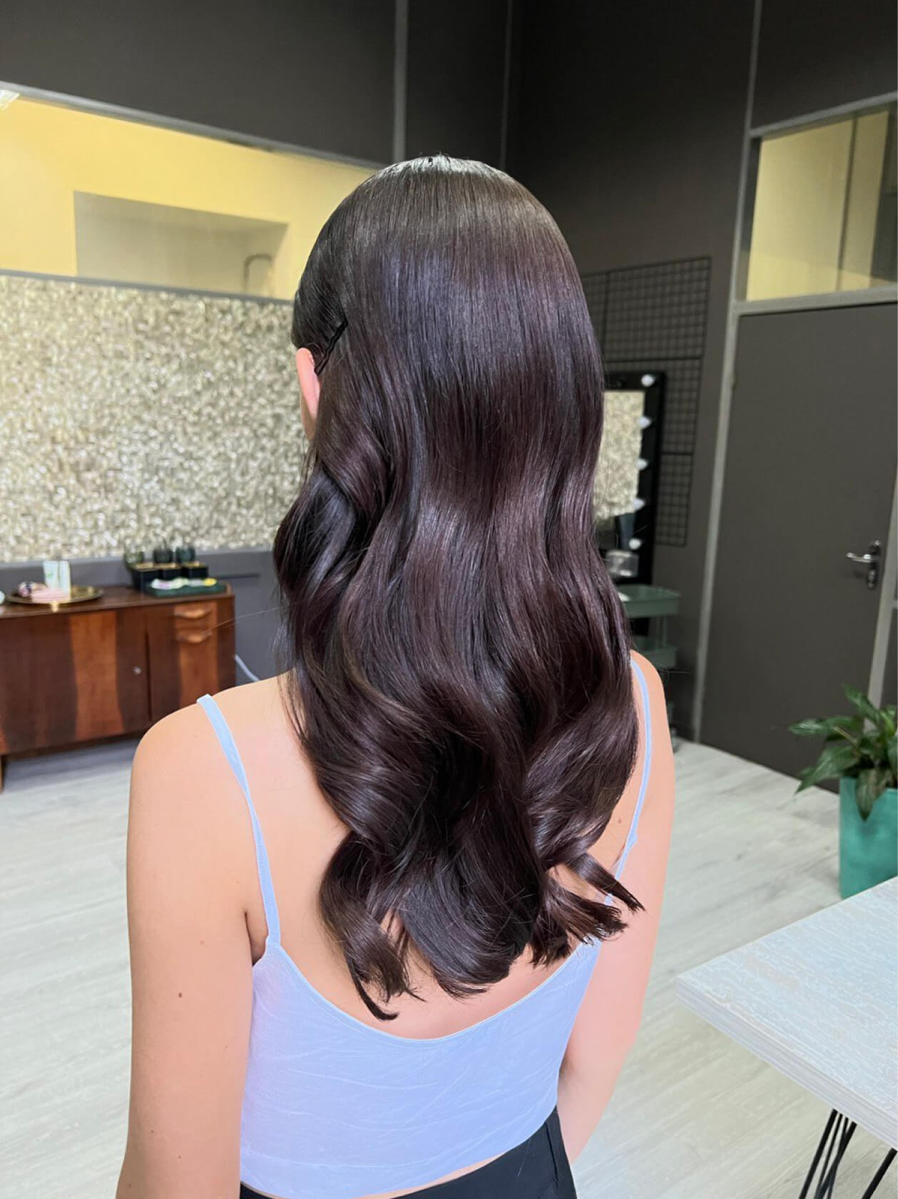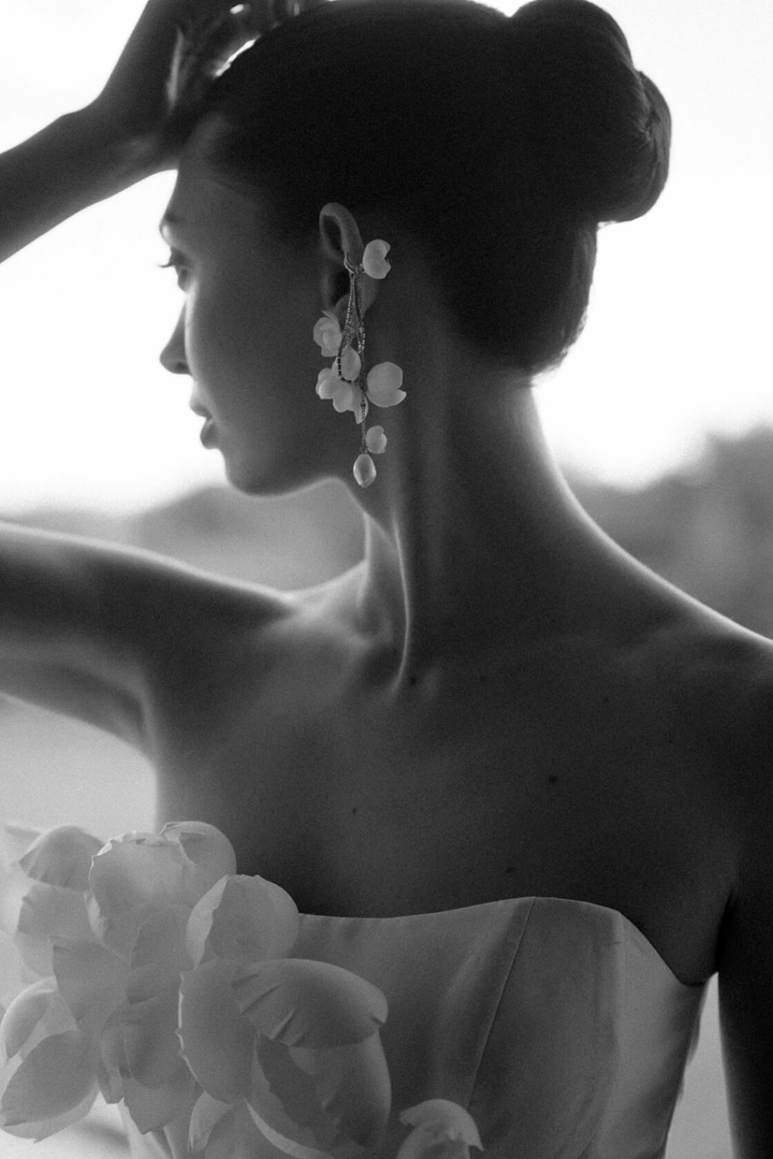 Чтобы этого не происходило, мы заранее напитали волосы увлажняющим стайлингом и запечатали кутикулу феном, а уже потом собрали пучок.