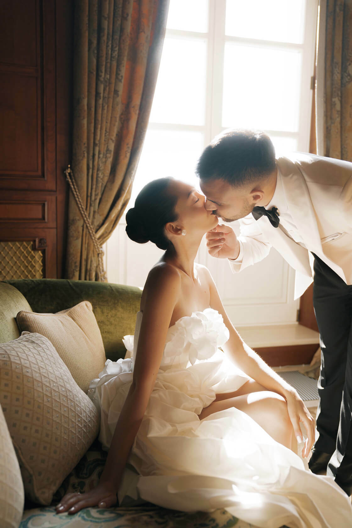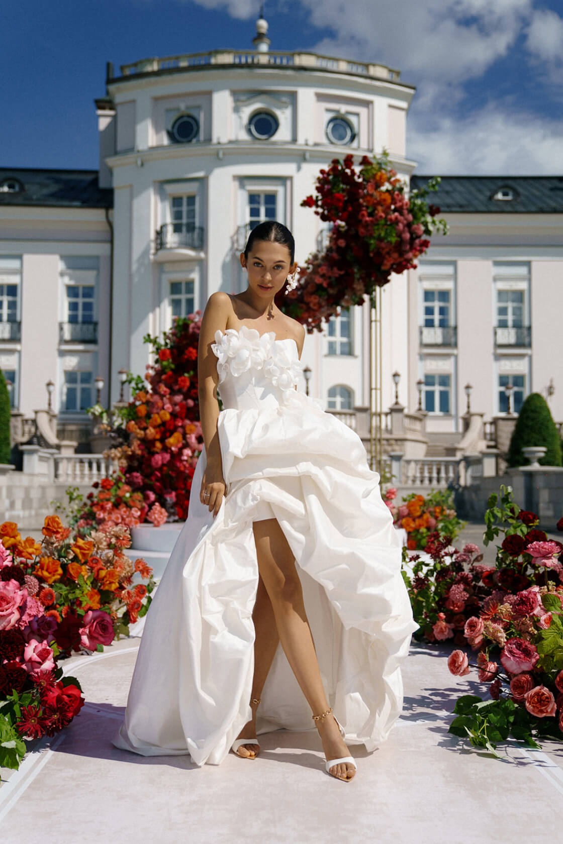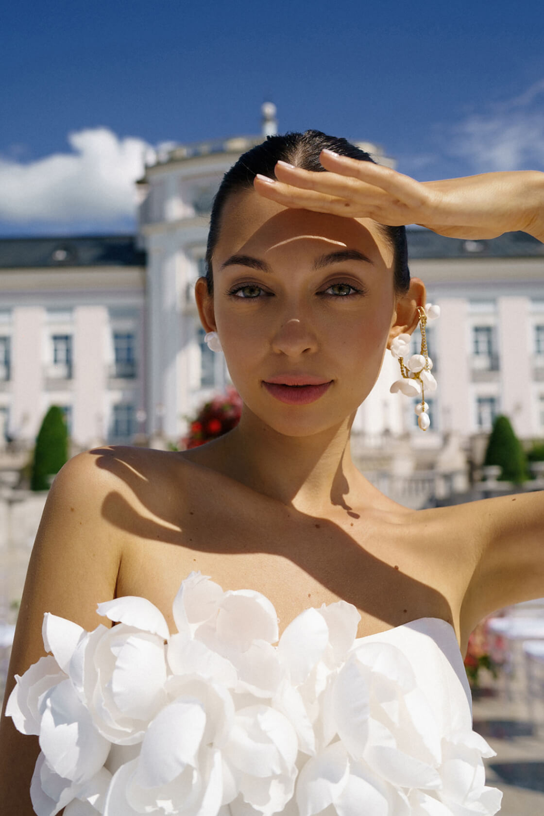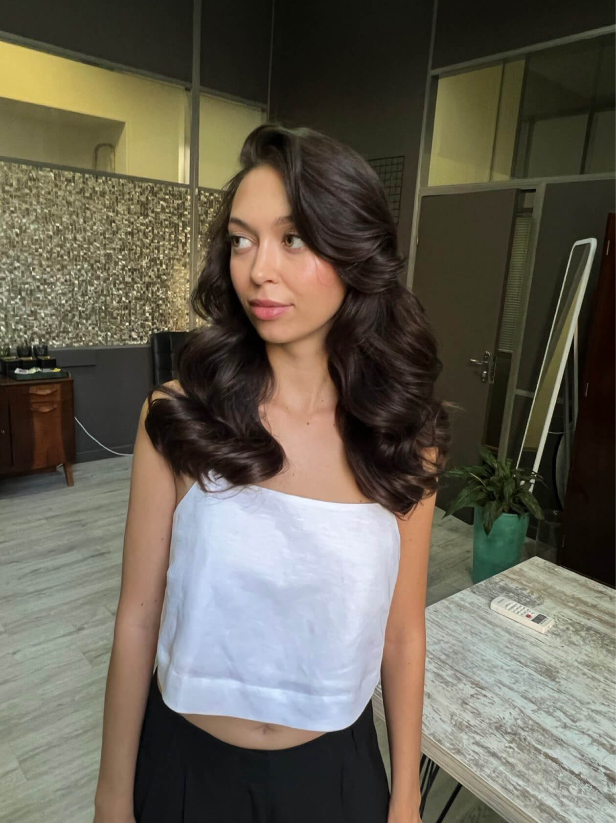 Чтобы этого не происходило, мы заранее напитали волосы увлажняющим стайлингом и запечатали кутикулу феном, а уже потом собрали пучок.